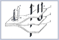 1 - tkanina zewnętrzna, 2 - membrana paroprzepuszczalna, 3 - podszewka, 4 - krople wody, 5 - para wodna, 6 - wiatr.