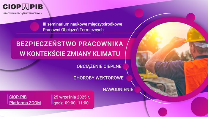 Serdecznie zapraszamy do udziału w seminarium naukowym pt. „Bezpieczeństwo pracownika w kontekście zmiany klimatu" organizowanym przez Pracownie Obciążeń Termicznych Centralnego Instytutu Ochrony Pracy – Państwowego Instytutu Badawczego.