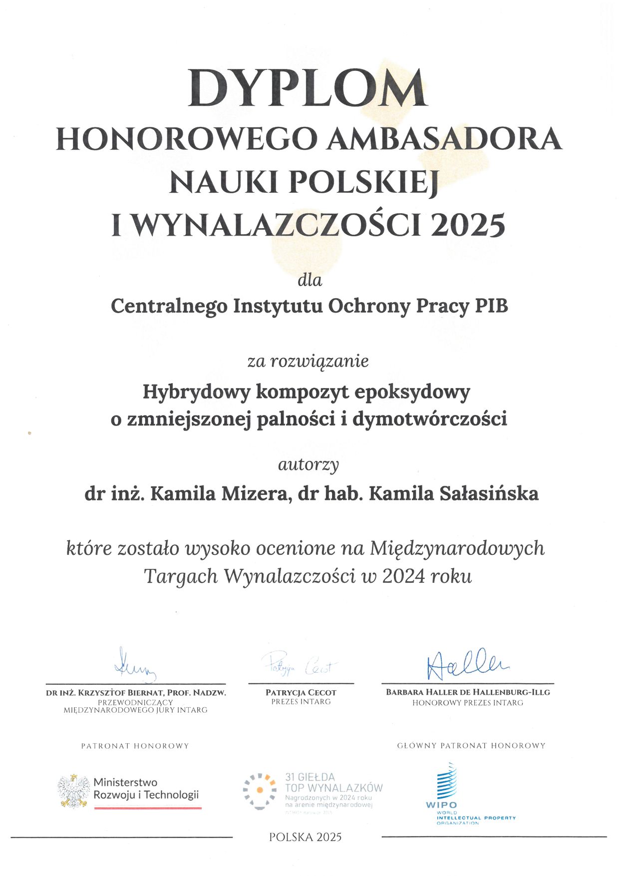 DYPLOM HONOROWEGO AMBASADORA NAUKI POLSKIEJ I WYNALAZCZOŚCI DLA CIOP-PIB