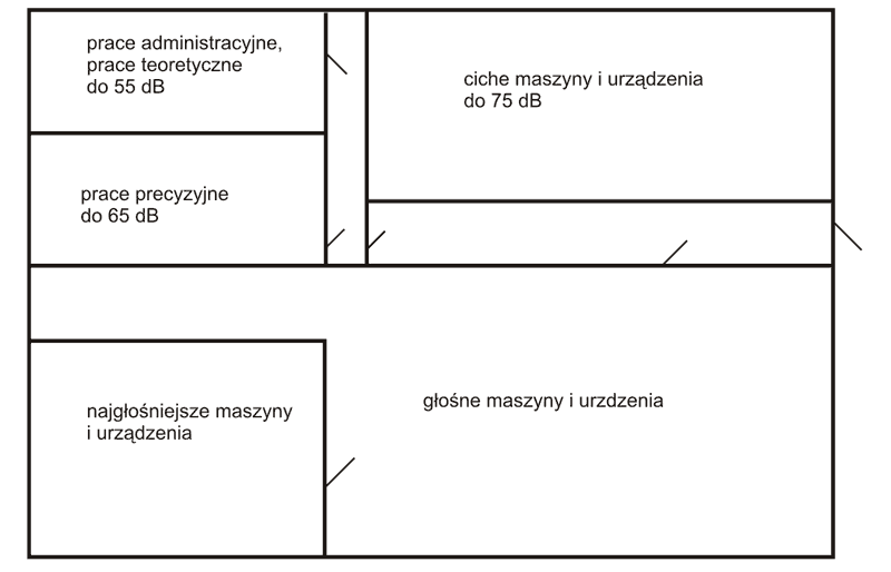 Dzięki grupowaniu źródeł hałasu w różnych pomieszczeniach oraz rozdzieleniu obszarów prac o różnych poziomach emisji hałasu, pracownicy obsługujący cichsze urządzenie (w znajdujące się w jednym pomieszczeniu) nie są narażeni na hałas docierający z urządzeń głośniejszych (znajdujących się w innym pomieszczeniu). Dzięki temu ograniczana jest liczba pracowników zagrożonych hałasem. Przykład takiego działania pokazano na Rys. 6.