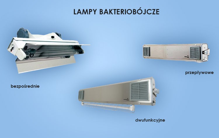 Lampy przeznaczone do dezynfekcji wnętrz promieniowaniem UV-C dostępne są w trzech rodzajach: do bezpośredniego naświetlania, lampy przepływowe i lampy dwufunkcyjne (pracują jednocześnie w trybie przepływu i naświetlania). Lampy do bezpośredniego naświetlania najbardziej zagrażają człowiekowi, bowiem promiennik UV-C nie jest w nich przesłonięty żadnym konstrukcyjnym elementem oprawy. W związku z tym wolno je stosować w pomieszczeniach tylko bez obecności człowieka. W lampach przepływowych promiennik UV-C zamknięty jest w obudowie, przez którą przepływa powietrze oczyszczone najpierw mechanicznie przez zestaw filtrów. W związku z tym, promieniowanie UV-C nie wydostaje się z takiej oprawy na zewnątrz – co zapewnia bezpieczeństwo osobom w jej pobliżu. Lampy dwufunkcyjne pracują jednocześnie w trybie przepływowym i naświetlającym (posiadają dodatkowy promiennik). W związku z tym wolno je stosować w pomieszczeniach tylko bez obecności człowieka.